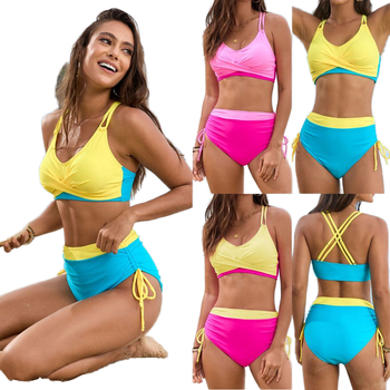 Kadınlar için 2025 yeni düz renk iki parçalı Bikini yüksek bel İpli düz renk Patchwork kravat çapraz çanta dış ticaret için