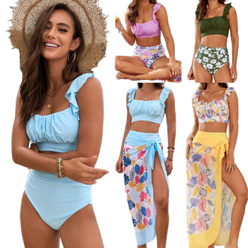 ชุดว่ายน้ำ3ชิ้น2025ใหม่มีขอบระบายพิมพ์โลโก้ด้านหน้าพิมพ์ลายแบบสองชิ้นสำหรับการค้าต่างประเทศ